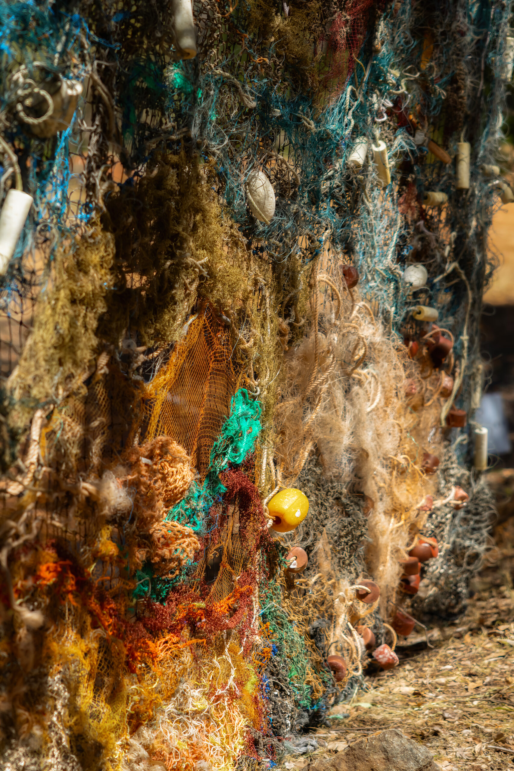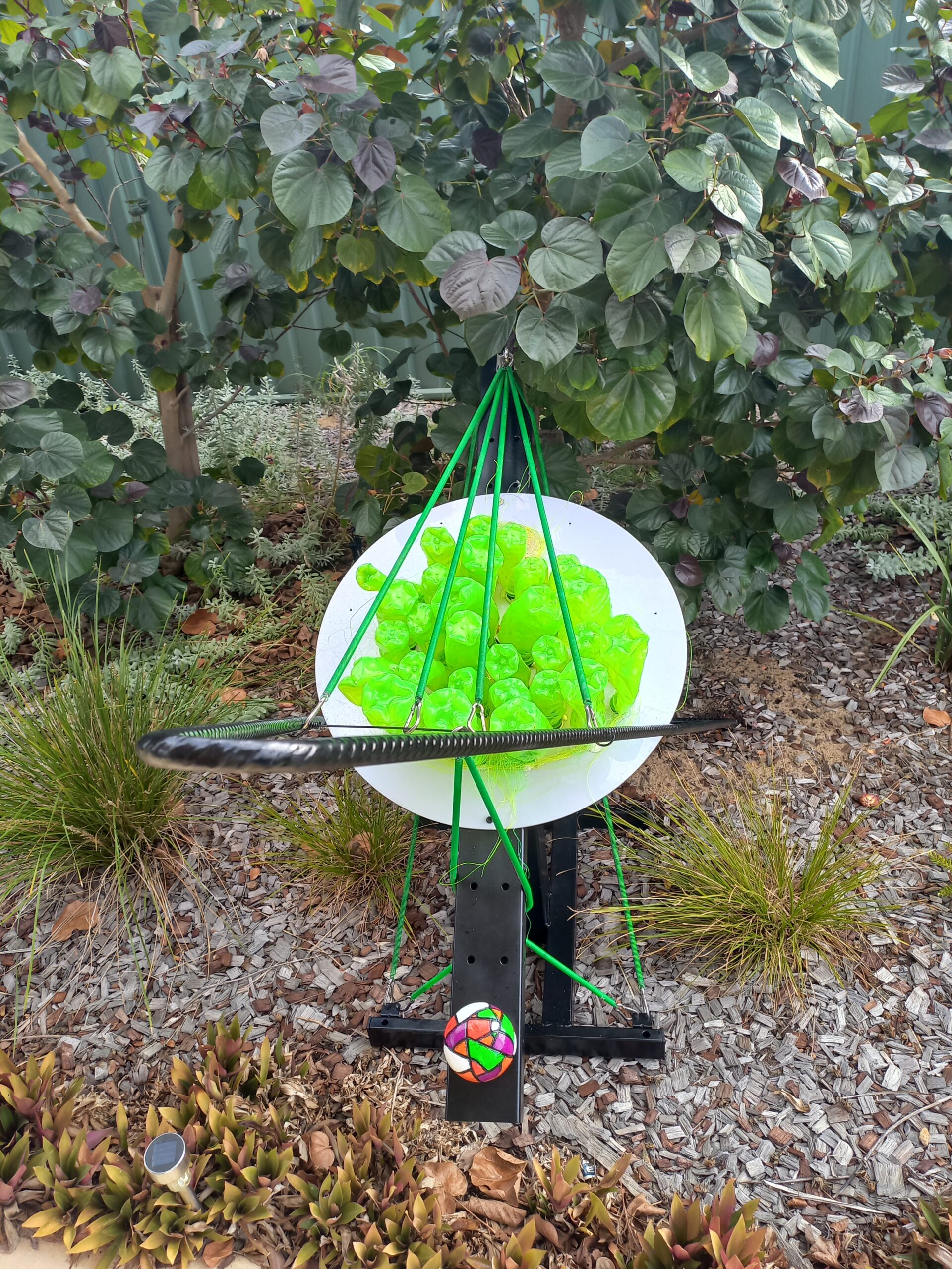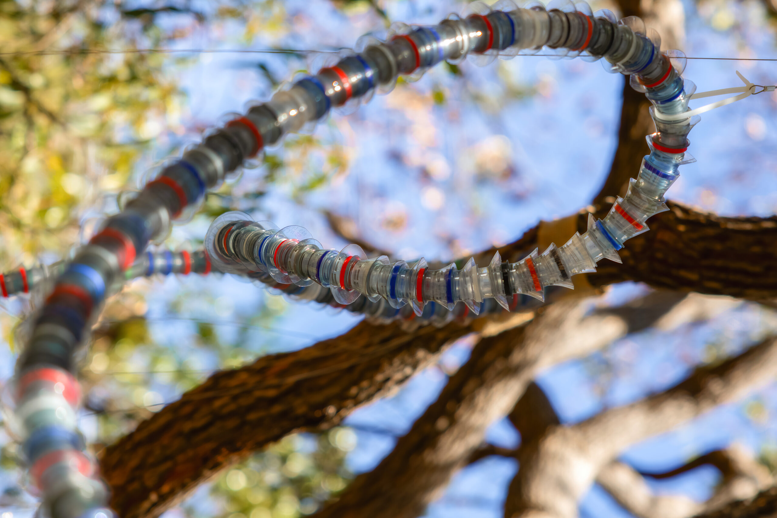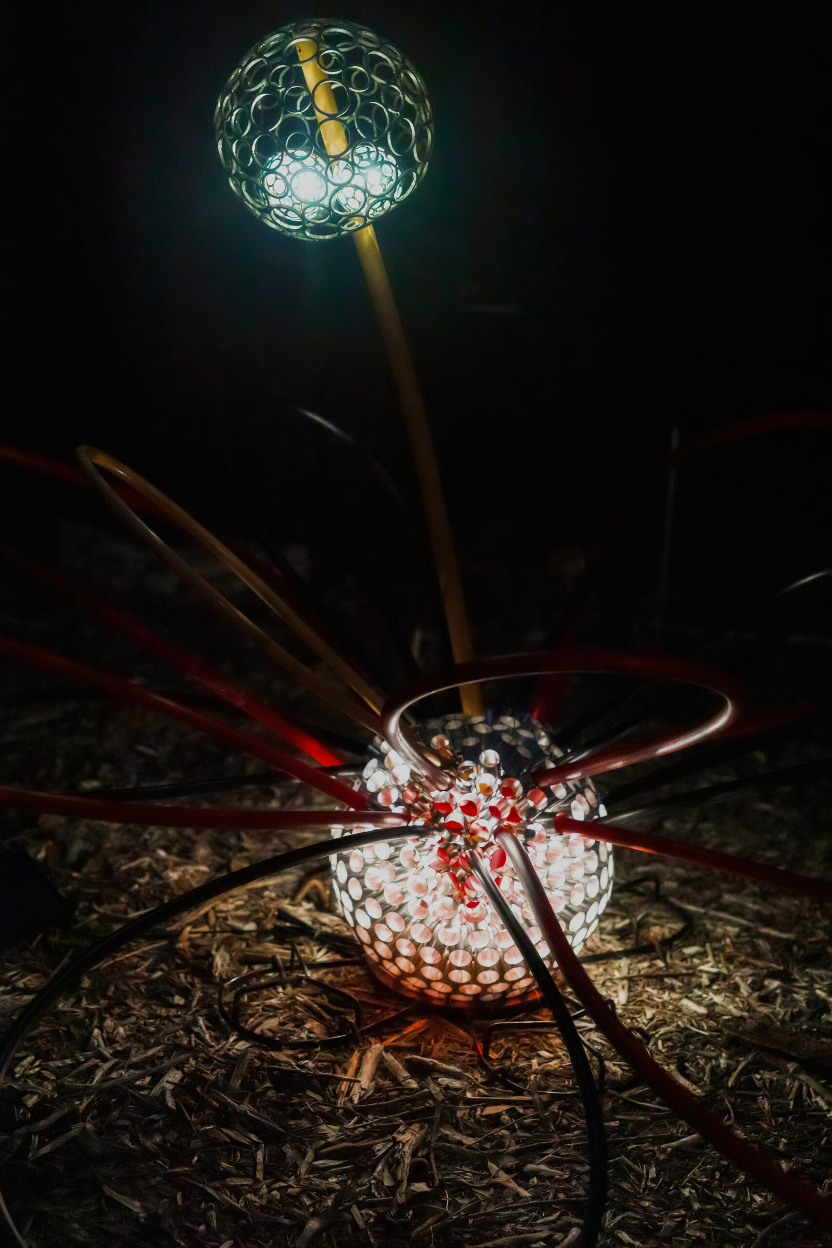 Scrap steel, recycled Mountain Dew bottles, acrylic, recycled fishing line, clay, led UV lights