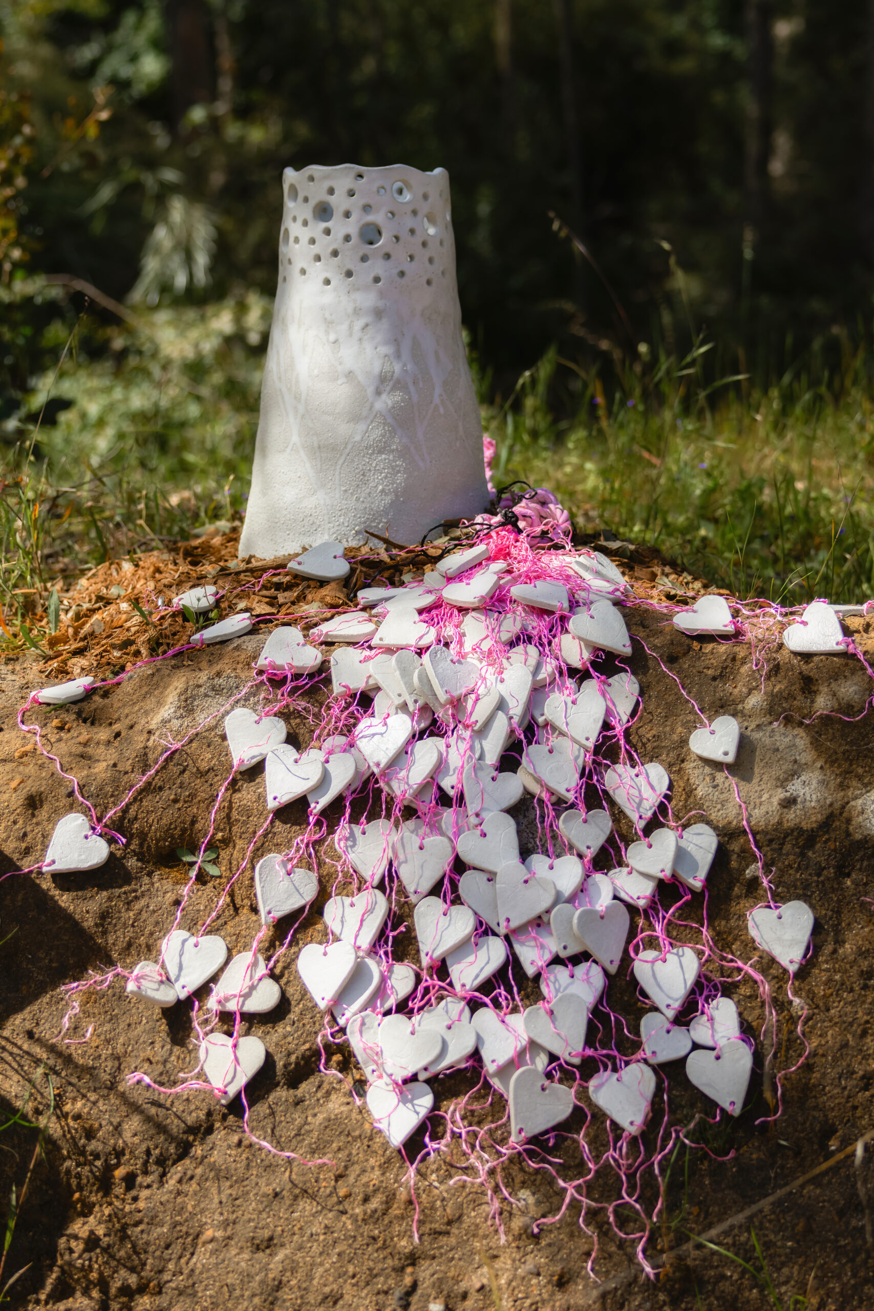 Recycled white raku clay, embossed linen thread on hearts, satin glaze, found rope. Vessel: $300, Hearts on found rope: $150