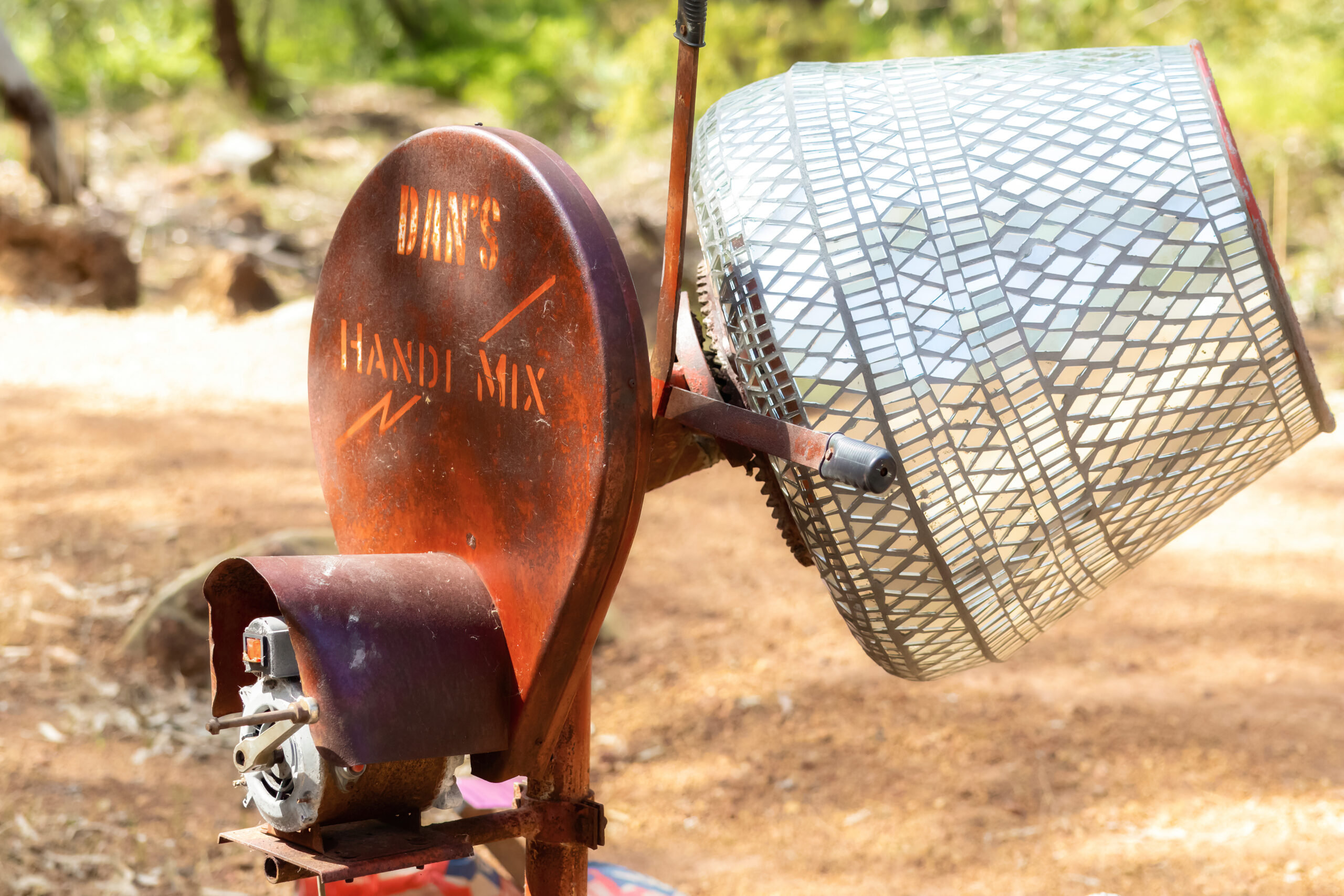 Retired Cement mixer, hand cut reclaimed mirror, light